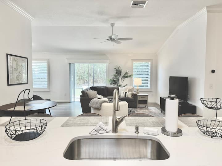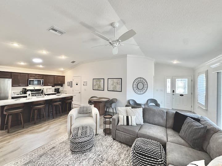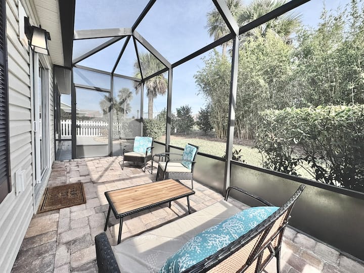 POŠALJITE UPIT ZA MJESEČNE CIJENE. Prekrasan, dobro opremljen smještaj s 2 spavaće sobe i 2 kupaonice u selu McClure, pažljivo uređen i pripremljen sa sadržajima, uključujući natkriveni lanai okružen zelenim zidom za privatnost, vozilo za golf, 2 kompleta palica za golf i 2 brdska bicikla. Praktično blizu potpuno novog EASTPORT TOWN SQUAREA i SAWGRASS SQUAREA s trgovinama, restoranima i BESPLATNOM noćnom zabavom. U blizini trgovina u Magnolia Plazi za namirnice i obroke. Živite kao stanovnici sela u ovom prekrasnom smještaju!