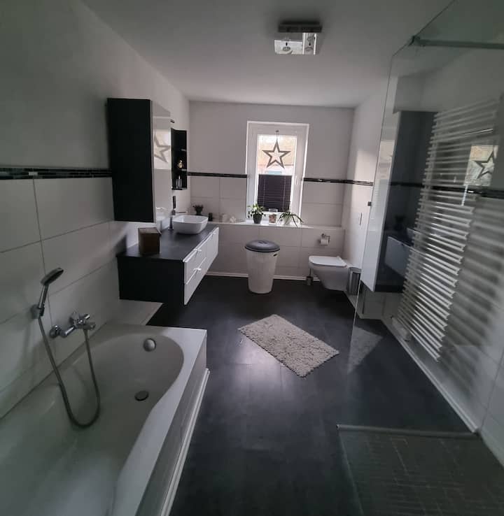 Kupaonica: moderna, svijetla kupaonica s tušem s efektom kiše i odvojenom kadom – savršena za opuštanje nakon dugog dana u prirodi.