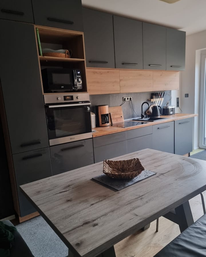 Moderna potpuno opremljena kuhinja: pripremajte obroke u kuhinji u antracit boji s visokokvalitetnim elementima koji izgledaju poput drva. Potpuno je opremljen: