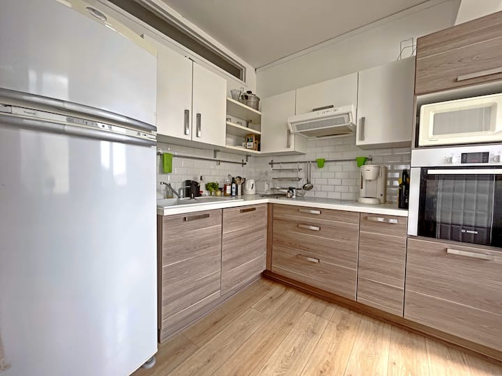 La cuisine entièrement équipée comprend : réfrigérateur, congélateur, plaque de cuisson, four, micro-ondes, cafetière filtre, bouilloire, grille-pain et lave-vaisselle.