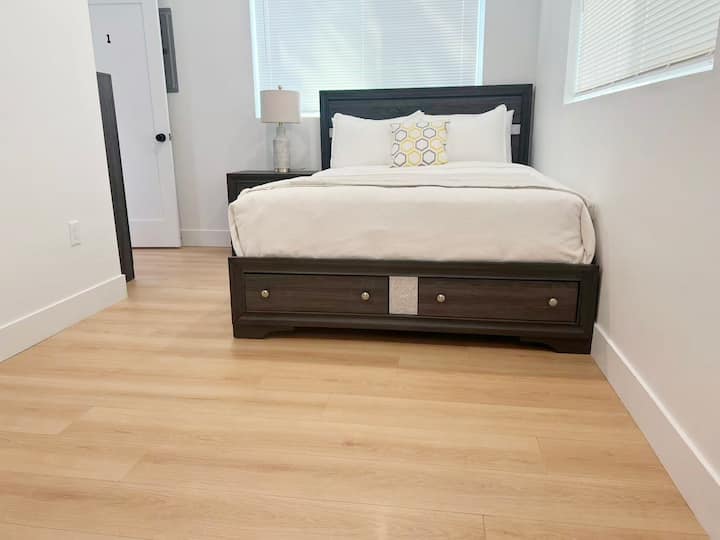 Moderna spavaća soba s bračnim krevetom (širine 150 – 179 cm) u prizemlju sa zajedničkom kupaonicom