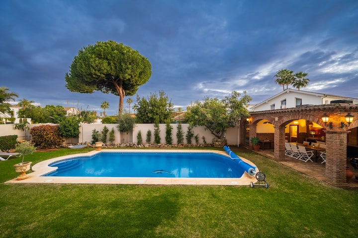 Puerto Banus je odmah iza ugla, udaljen 3 minute vožnje automobilom i 30 minuta šetnje šetnicom uz plažu koja vodi sve do Marbelle. Vila ima 395 m2 raspoređenih na 3 kata, 6 spavaćih soba s novim krevetima i TV-om, 3 spavaće sobe s vlastitom kupaonicom i 3 s izlazom na gornju terasu. U prostranoj blagovaonici može udobno jesti 12 ljudi. U salonu se nalazi lijep prostor za sjedenje s kožnim sofama oko televizora i kamina, a tu je i stol za bilijar koji nudi odličnu zabavu za vas i vaše najmilije. Odavde imate pristup i glavnoj terasi kuće s prostranim prostorima za sjedenje.