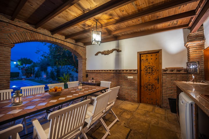 Terasa je savršeno mjesto za pripremu vrlo posebnog obroka ili roštilja za vaše najmilije. Ima potpuno opremljen prostor za kuhanje s prostranom kuhinjom s pultom koji ima dvostruki sudoper i aparat za espresso. U dvorištu se nalazi i pomoćni WC s umivaonikom, ogledalom i tuš-kabinom. Ovaj smještaj doista spaja potrebu za potpunom udobnošću, zabavom, pripremanjem dobrog obroka i provođenjem vremena s dragim osobama. Također odgovara vašoj potrebi za tradicionalnim dizajnerskim prostorom, s ciglenim stupovima i drvenim vidljivim gredama, tradicionalnim drvenim namještajem i jednostavnim lusterima od kovanog željeza.