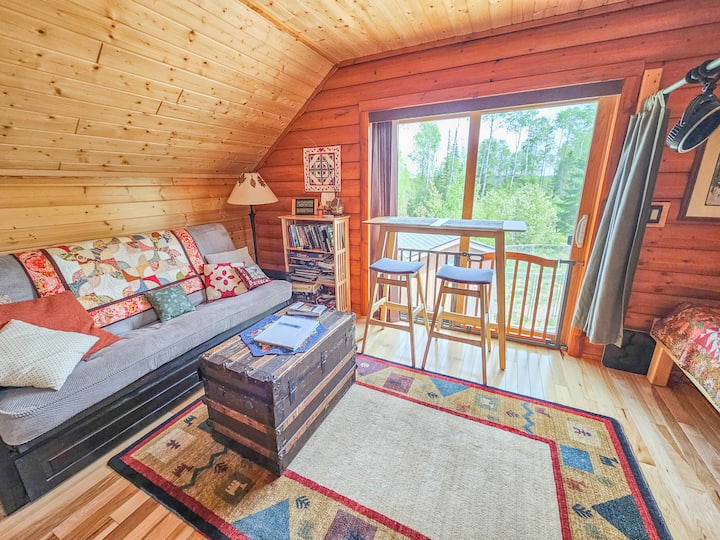 Ne samo jednu od najjedinstvenijih smještaja koje ćete pronaći uz sjevernu obalu jezera Superior ili u blizini divljine i vrhunske planinarske staze Boundary Waters Canoe Area, već i apsolutno jedinstven doživljaj! Naš apartman za goste ima rustikalne podove od hikorija i kuhinjske ormariće, stropove od borovine s čvorovima, unutarnje bočne zidove od pola drva i jezero Superior. Nema više rustikalne sjeverne šume/sjeverne obale od ovoga! Ovo je svijetli prostor ispunjen prirodnim svjetlom s velikog prozora na vratima terase i tri krovna prozora.