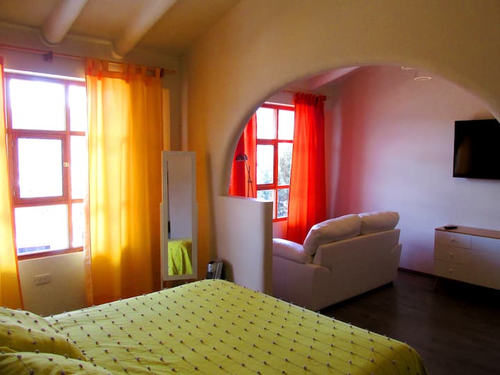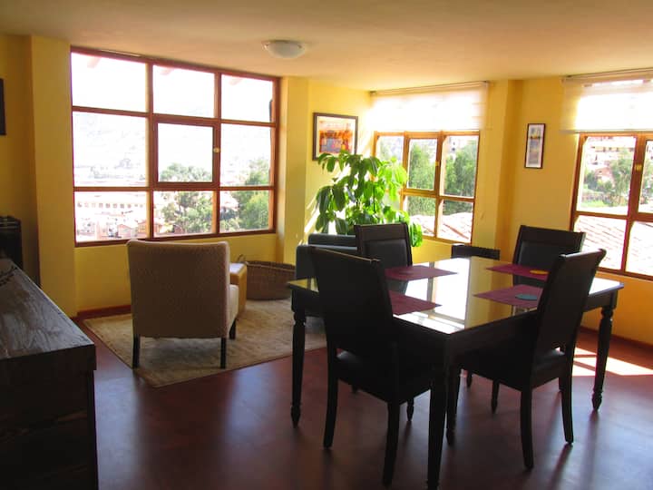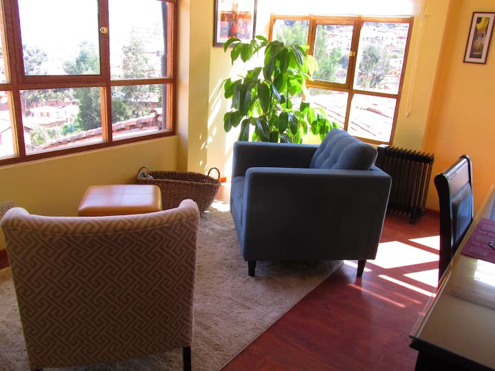 U dnevnom boravku nalazi se veliki stol; ako putujete poslovno, ovo je savršeno mjesto za rad s prijenosnim računalom i dokumentima. Sunčeva svjetlost ispunjava prostoriju zahvaljujući 3 velika prozora (jedan od njih - koji izravno daje centru Cusca - jednostavno je golema). Kuhinja je u potpunosti opremljena: mini-hladnjak, mikser, aparat za kavu, mikrovalna pećnica... i sve što vam je potrebno za pripremu hrane i posluživanje.