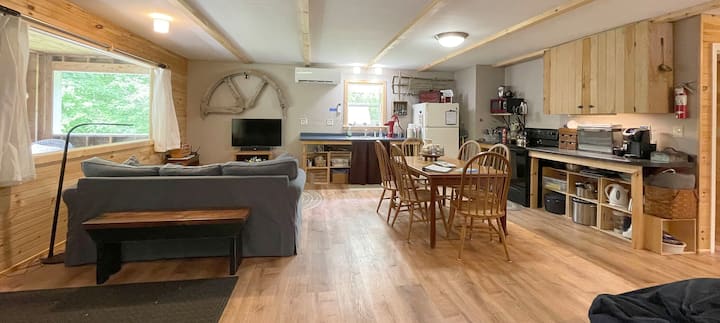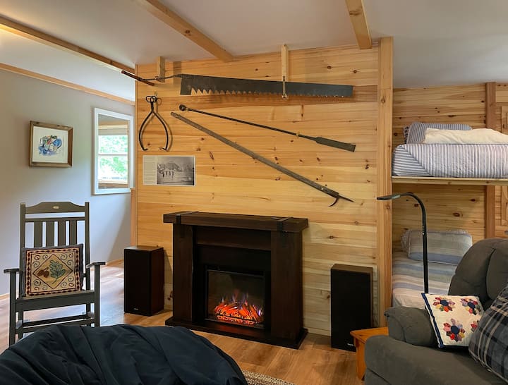 Tu je spavanje za 10 osoba, kuhinja, blagovaonica, mala kupaonica s tušem (bez kade), dnevni boravak, dizalica topline/klima-uređaj, električni kamin, Wi-Fi, Roku TV s streamingom i lokalne postaje u zraku, Blu Ray player i filmovi, stereo w/Bluetooth i veliki natkriveni trijem. Obroci se ne poslužuju, iako su uz Keurig na raspolaganju kava i čaj. Na zahtjev je na raspolaganju cijeli popis kuhinjskog posuđa. Kreveti na kat nalaze se u zajedničkoj prostoriji.