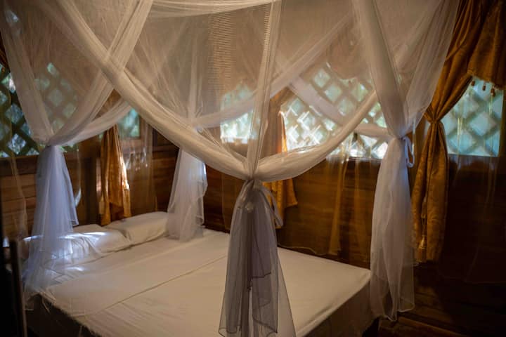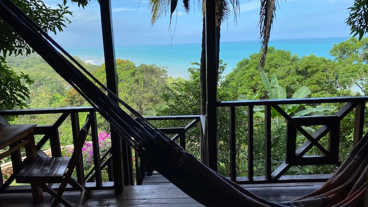 Drvena kuća okružena morem i šumom