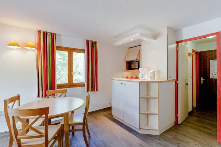 Karakteristike smještaja za odmor :Studio za 4 osobe. Nalazi se na 3. katu. Pogled na ulicu, izloženost istoku. Potpuno opremljena kuhinja : veliki hladnjak, ploča za kuhanje, mikrovalna pećnica, perilica posuđa, aparat za kavu, kuhalo za vodu, toster, posuđe i pribor za jelo. Oprema: grijanje, ormarić za skijašku opremu, sef, glačalo i stol, sušilo za kosu, televizija. Napomena: radovi će se odvijati cijelo ljeto ispred rezidencije.