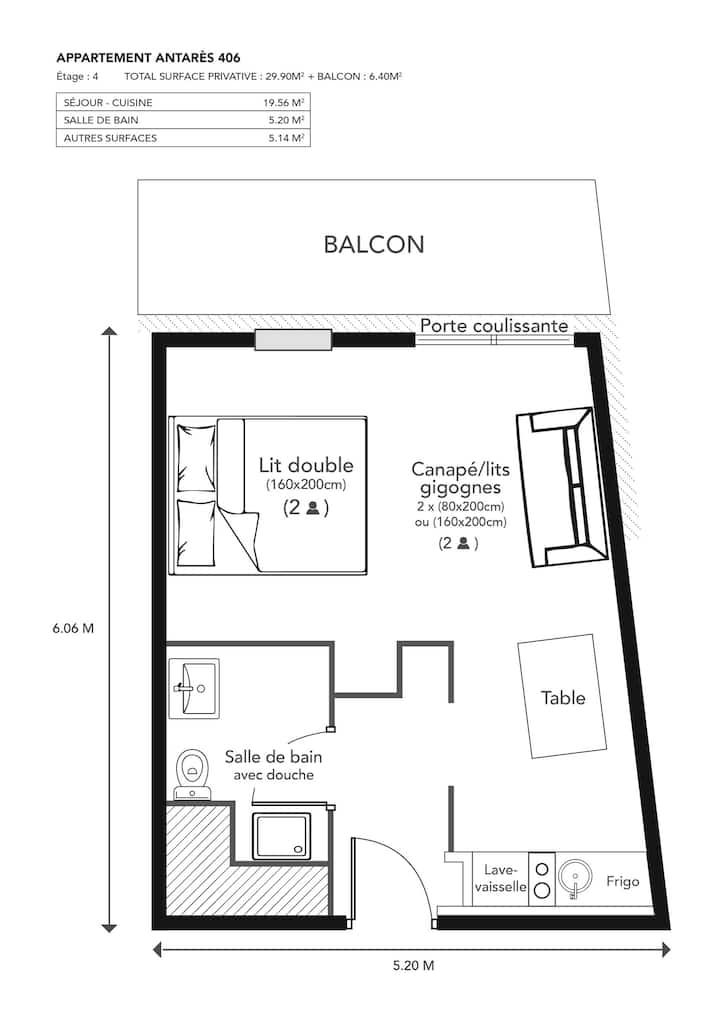 Studio apartman, koji se nalazi na 4. katu rezidencije Antarès, postavljen je na sljedeći način :