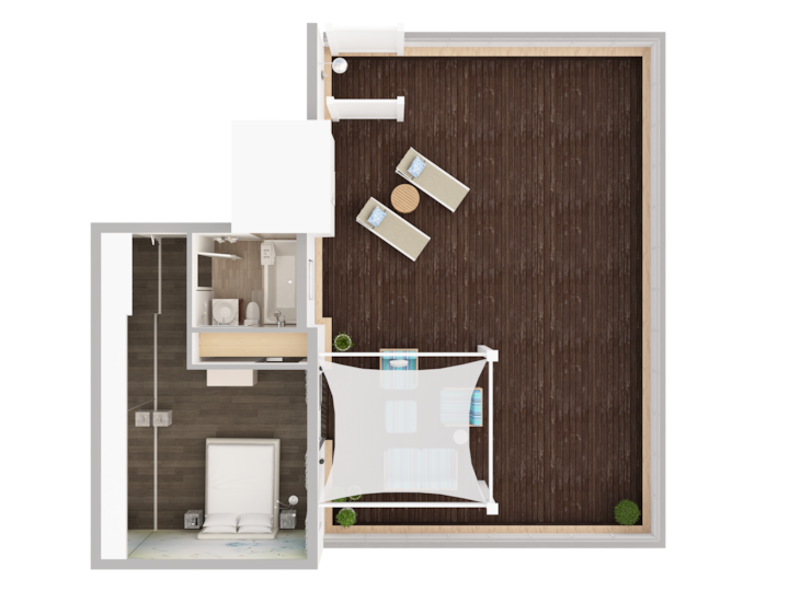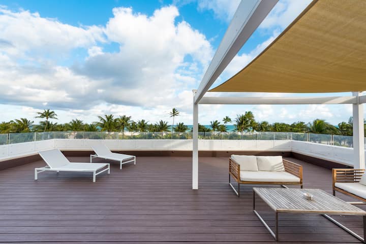 Prostrana soba od 250 četvornih metara na gornjem katu s našom terasom na obali – 1 bračni krevet (veličine king): uživajte u prostranom bračnom krevetu (veličine king), unutarnjem i vanjskom boravku s visokim stropovima i velikim prozorima te privatnoj terasi s panoramskim pogledom na ocean i Ocean Drive, vanjskom tušu i prostoru za sjedenje. U unutrašnjosti se možete opustiti uz moderne sadržaje kao što su klima-uređaj, besplatni bežični internet, pametni televizor, mini-hladnjak, sef u sobi i privatna kupaonica. Savršeno za romantičan ili miran odmor na samo nekoliko koraka od plaže