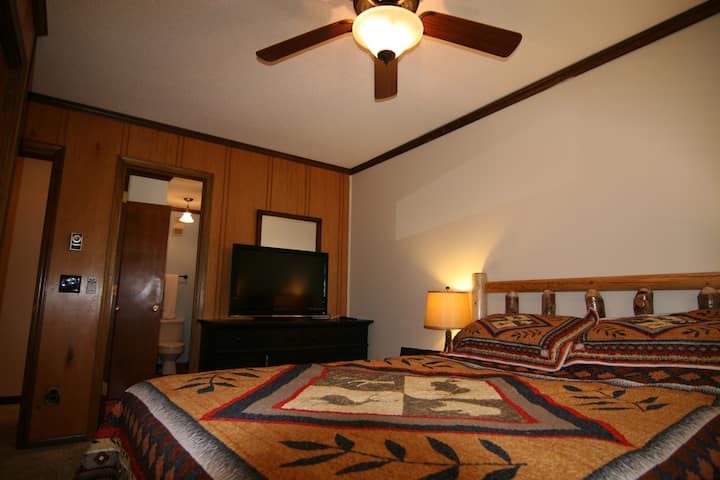 Može primiti 6 odraslih osoba na krevetima i još 2 djece na kauču na razvlačenje(više od 8 osoba zadržat će vašu rezervaciju) . 50' Flat Screen TV sa sustavom kućnog kina. Raspodijeljeni kameni bazen i masažne kade dostupni su uz naknadu i nalaze se prekoputa uz stepenice.