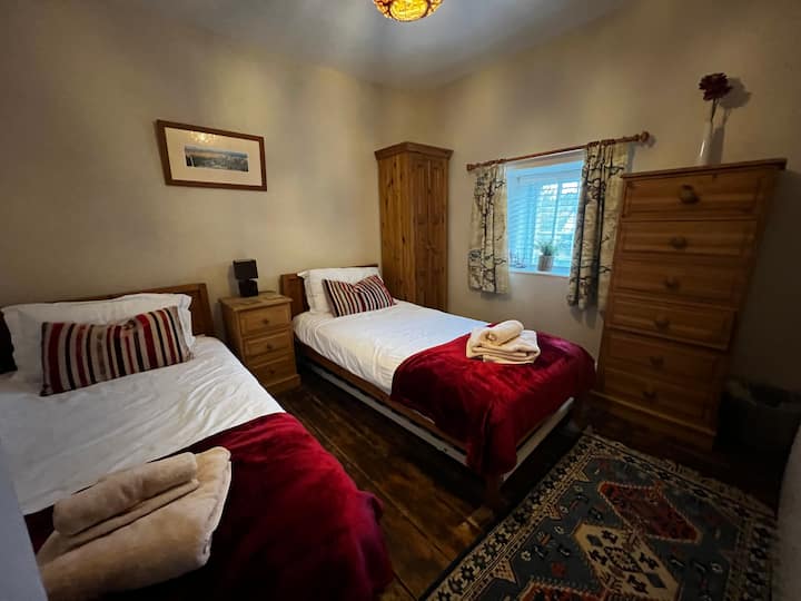 Stepenice vas vode do dvije spavaće sobe dobre veličine. Majstor ima kamin (koji ne gori), bračni krevet, ladice i ormar. Twin ima dva kreveta za jednu osobu u punoj veličini, ormar i ladice. Oba kreveta imaju pamučnu posteljinu i ručnike dobre veličine za upotrebu u seoskoj kućici. Posteljina i ručnici su osigurani. Daska za glačanje, stolica za hranjenje i putni krevetić nalaze se u spavaćoj sobi. Ponesite vlastite ručnike za plažu i posteljinu za putni krevetić.