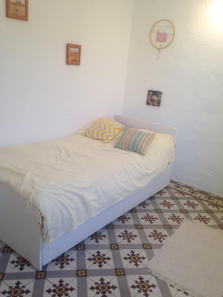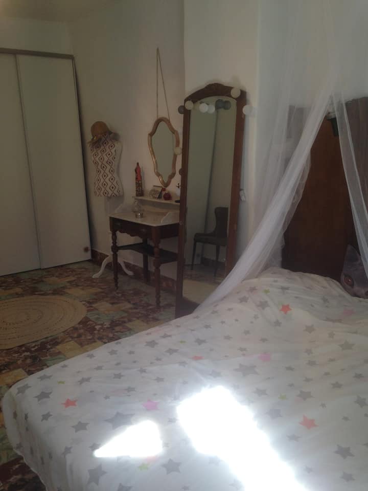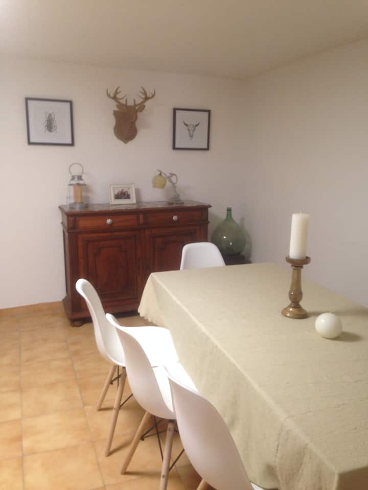 Stan u prizemlju je miran, okružen zelenilom. Tu je terasa za doručak, soba s bračnim krevetom i zajednička kupaonica. U blizini je autobusna stanica i trgovine.