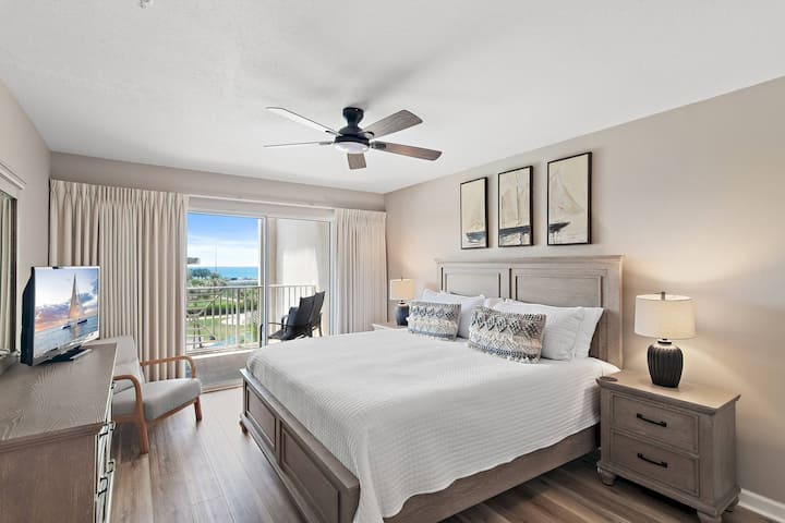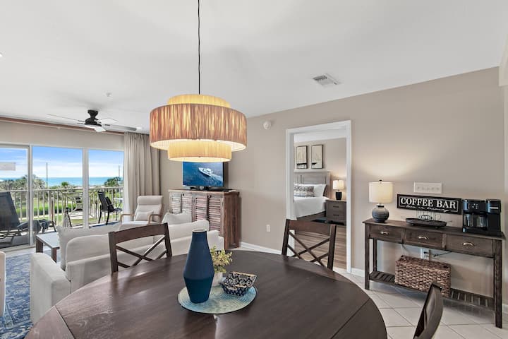 Uživajte u privatnom velikom balkonu i suncu na Floridi s nevjerojatnim izlascima sunca i slikovitim akvarelima zalaska sunca u ovom ukusno uređenom (dvosobnom stanu). Kondominij za osam osoba dizajniran je s popločanim podovima u glavnim prostorima otvorenog tlocrta koji svima omogućuje razgovor u kuhinji, blagovaonici i dnevnom boravku. Kuhinja je dobro opremljena hladnjakom, električnom pločom za kuhanje, perilicom za posuđe i mikrovalnom pećnicom. Vaš kuhar može imati vlastiti prostor s dodatnim prostorom za pozivanje pomagača. Stol u blagovaonici ima mjesta za sjedenje za (6) osoba, a kuhinjski pult ima mjesta za sjedenje za (4) osobe. Stol na terasi također ima sjedala za (4). Ako se odlučite za roštilj, na raspolaganju vam je više zajedničkih roštilja uz bazen i u stražnjem dijelu zgrade.