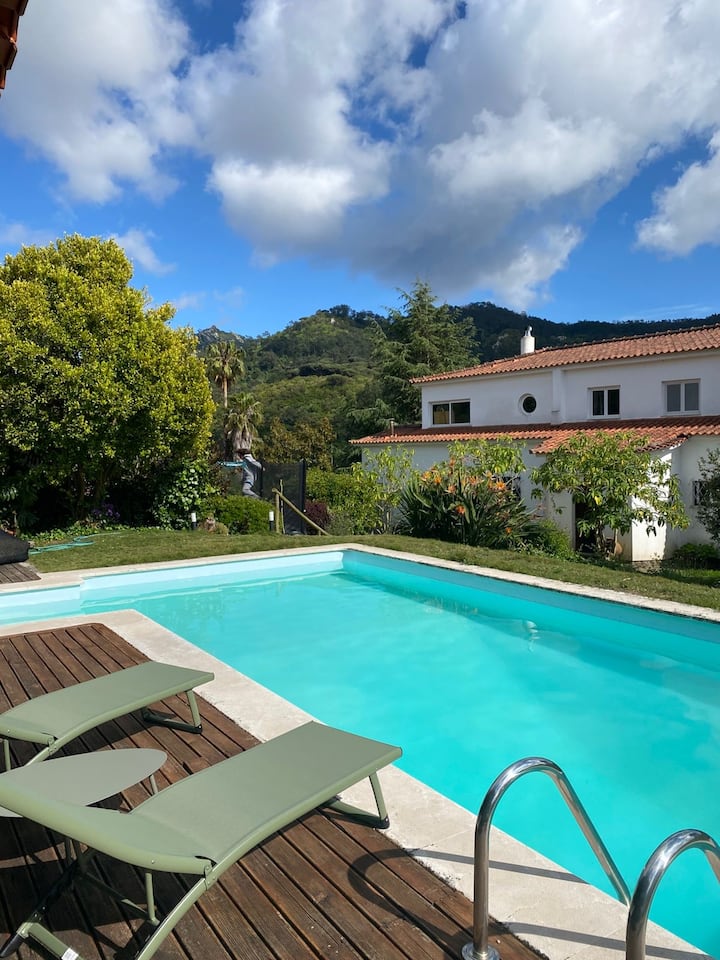 Kuća se nalazi usred prostranog vrta, pa je gosti mogu uživati u izravnom kontaktu s prirodom i pogledu na planine Sintre. Zahvaljujući tome, u ovom smještaju možete uživati i u vanjskom bazenu, natkrivenom prostoru za roštilj, sauni te raznim osamljenim mjestima za druženje, čitanje i opuštanje. U tom ogromnom prostoru također se nude razne vrste igara i aktivnosti za djecu.