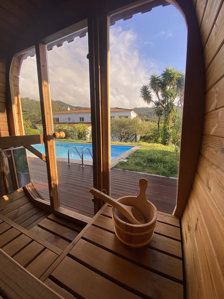 Iz povišenog bazena pruža se neposredan pogled na planine Sintre – to je šarmantno mjesto za provođenje ljetnog poslijepodneva uz ručak na terasi uz bazen ili u hladovini stoljetnog bora koji uokviruje vrt. Sauna, koja je također smještena tako da pruža pogled na planine, pruža jednostavno i uistinu osvježavajuće iskustvo na kraju dana provedenog u planinarenju ili na plaži.