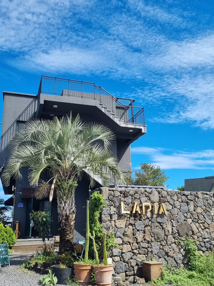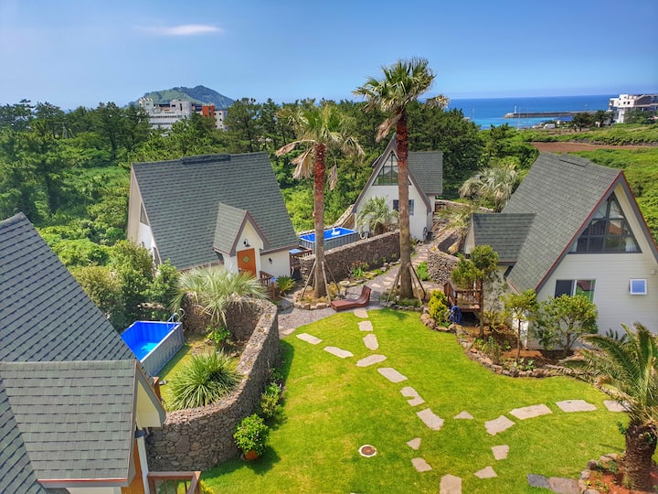 Kombinira palme i kamene zidove zasađene, tako da možete osjetiti prirodu i opuštanje Jejua tijekom svog boravka.