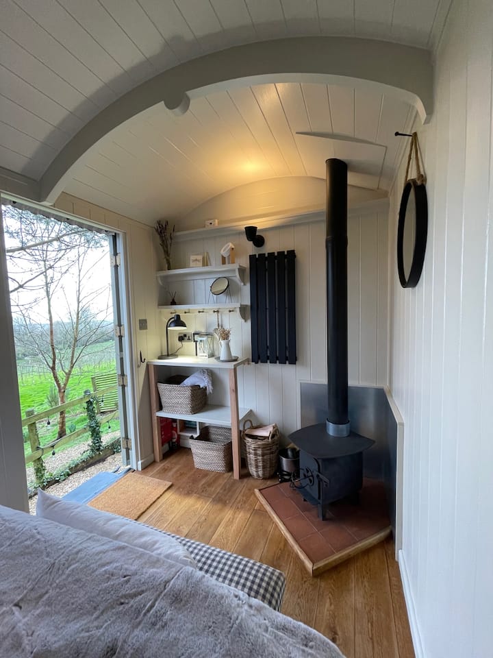 'The Hide' is a truly romantic hideaway on a English Vineyard with your own Shepherd's Hut, Cabin, Shower room & Private Wood Fired Hot Tub for two adults