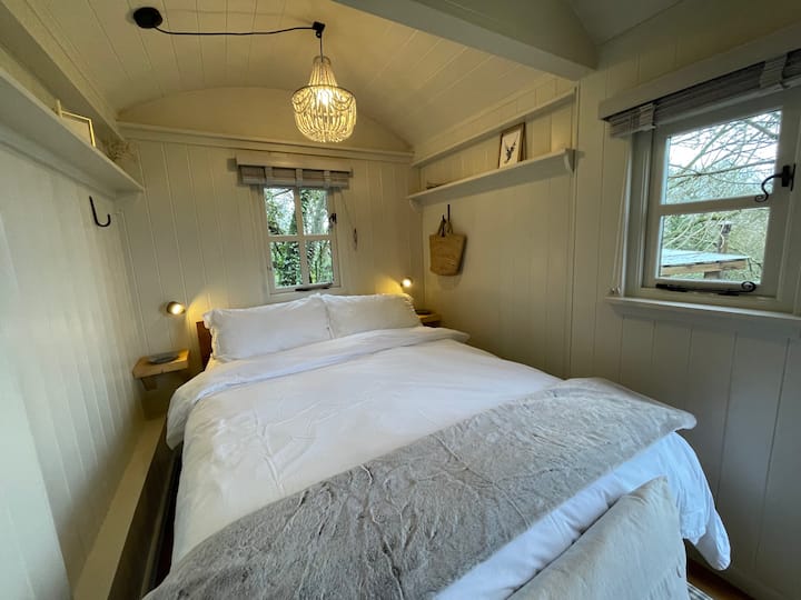 – Shepherd's Hut – ima lijepu atmosferu i topla je i udobna, uređena neutralnim bojama, čini se kao spokojan prostor čim uđete. Koliba je opremljena električnom rasvjetom i utičnicama, lijepim drvenim lusterom iznad kreveta, noćnim svjetlima, električnim radijatorom, a može se grijati i malim pećima na drva kako bi vam večeri bile ugodne i romantične. Košara od drva isporučena je s ložištem, ekološkim upaljačima i šibicama. U sobi postoji svijećnjak ako ne želite koristiti električne svjetiljke. Krevet je vrlo udoban i ima madrac od memorijske pjene. Posteljina je divan bijeli pamuk s mekim poplunom i jastucima i nekoliko udobnih, praktičnih bacanja za one hladnije večeri. Tijekom boravka na raspolaganju su vam sprej za spavanje od lavande i difuzor za sobu, kao i prijenosna svjetiljka, kuke i košare za pohranu i police.
