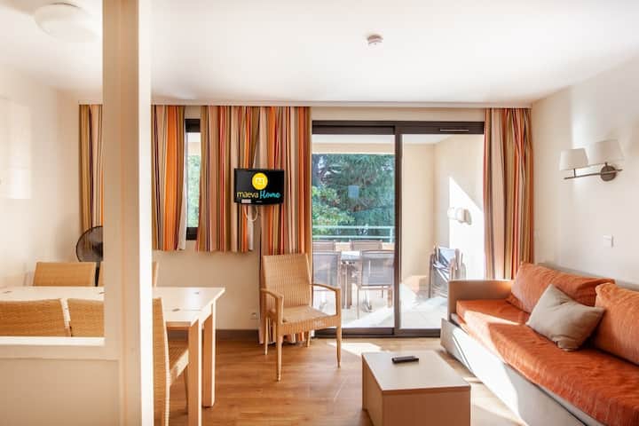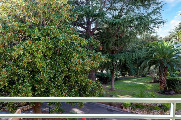 Prednosti vašeg najma : Stan s balkonom okrenutim prema jugu s pogledom na mediteranski park. Pristup zajedničkom bazenu, obližnjoj plaži i parkingu.
