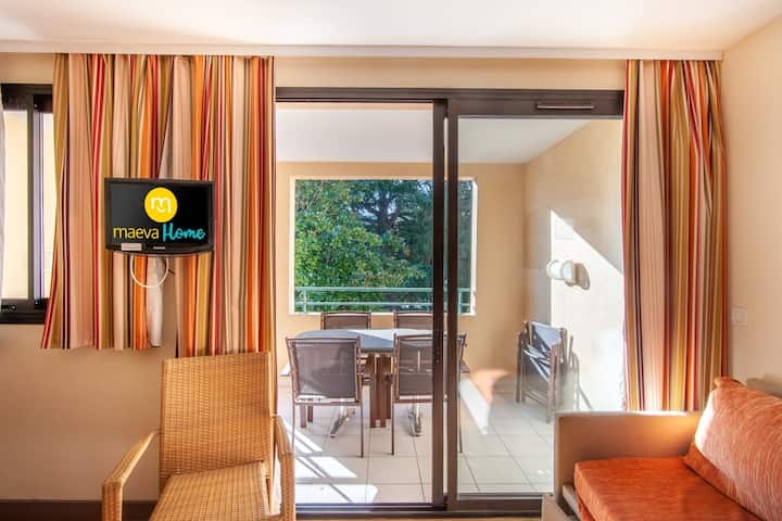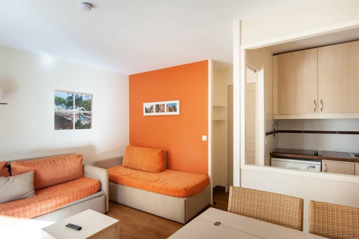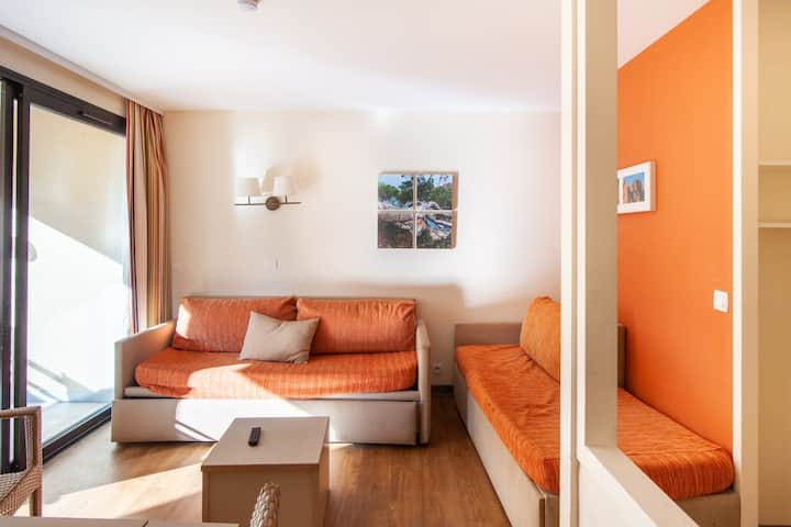 Vaš smještaj za odmor uključuje : 1 dnevni boravak, 1 kuhinju, 1 spavaću sobu, 1 brvnaru, 1 kupaonicu, 1 zaseban WC, 1 balkon i parking. Površina: 30 m². Lokacija: 2. kat, zgrada Matisse. Sastav dnevnog boravka: 2 kauča na razvlačenje (2 kreveta). Obrok: 1 stol sa 6 stolica. Poluotvorena kuhinja u dnevnom boravku . Sastav soba: Spavaća soba: 1 bračni krevet Brvnara: 1 krevet na kat + 1 krevet na razvlačenje. Sastav kupaonice: kada. 1 zaseban WC .