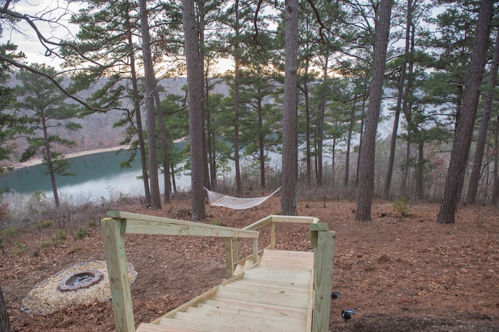 Skrovita brvnara s pogledom na jezero Beaver u blizini Eureka Springsa