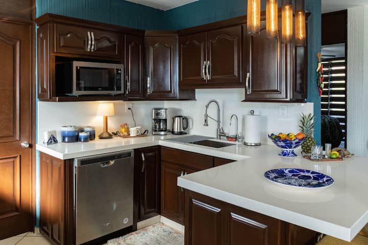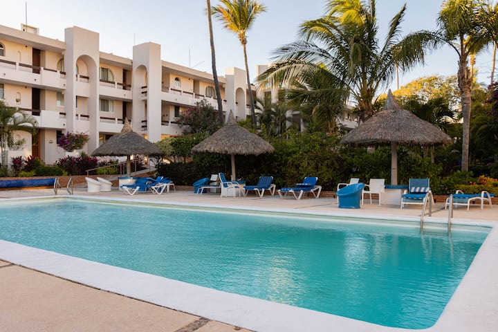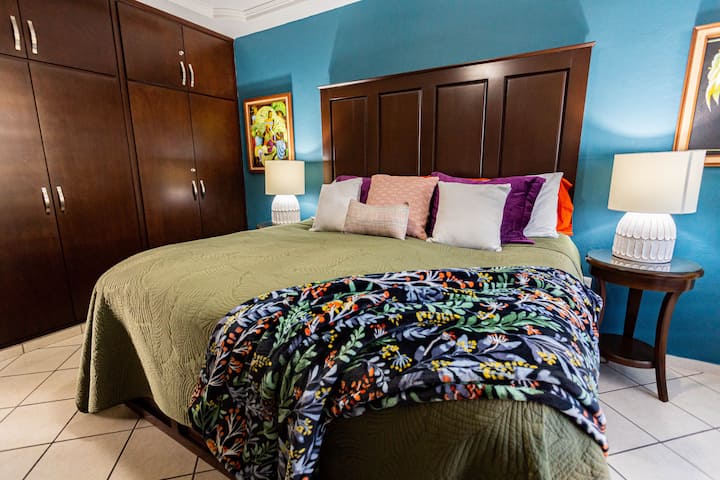 Moderan i dobro opremljen luksuzni privatni stan s jednom spavaćom sobom i jednom kupaonicom s bazenom, teniskim terenom, terenom za pickleball i pristupom netaknutoj privatnoj plaži. Središnji položaj s jednostavnim pristupom autobusima i taksijima za lokalne turističke atrakcije, restorane, trgovine i aktivnosti u povijesnom središtu Mazatlána. Uživajte u pogledu na vrt s balkona na trećem katu na kojem se nalazi prostor za sjedenje i plinski roštilj. Jednostavan pristup i šetnja do privatne plaže. Stan ima potpuno opremljenu kuhinju, besplatan Wi-Fi, TV, perilicu/sušilicu i klima-uređaj.
