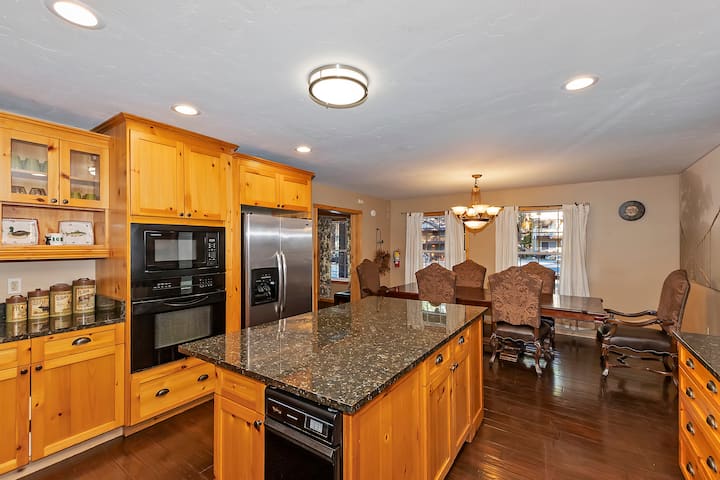 Kuhinja u brvnari prostrana je s mikrovalnom pećnicom i perilicom posuđa, velikim stolom za blagovaonicu i otočnim barom, novim štednjakom i mnoštvom mjesta za sjedenje. Možete se opustiti u velikom dnevnom boravku u brvnari u blizini kamina na plin i uživati u TV-u s velikim ekranom ili igrati igru bazena, stolnog nogometa ili zračnog hokeja na katu u igraonici. Na stražnjoj strani brvnare nalazi se vanjski spa centar i roštilj na drveni ugljen. Ova prostrana brvnara udaljena je pješice od Snow Summita i odlična je za zabavu velikih grupa. 2 glavne spavaće sobe imaju masažnu kadu. Spavaće sobe uključuju: Dolje: 2 bračna kreveta i 3 bračna kreveta, na katu: 2 bračna kreveta, 2 bračna kreveta. Lic #101855 Ostali sadržaji uključuju: kabelsku televiziju, 2 TV/2 VCR, 2 DVD, bežični internet, stereo, praonicu rublja, kamin, perilicu za posuđe, zračni hokej, stolni nogomet, stol za biljar, raznovrsne igre, roštilj na ugljen i spa na otvorenom. Glavna spavaća soba #1 - spavaća soba s bračnim krevetom #2 - spavaća soba s bračnim krevetom # 3 - spavaća soba s bračnim krevetom # 4 - spavaća soba s bračnim krevetom # 5 - spavaća soba s bračnim krevetom br. 6 - spavaća soba s bračnim krevetom br.