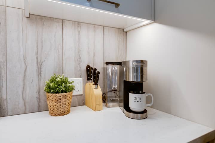 Čeka vas potpuno opremljena kuhinja, bilo da volite sami pripremati ukusna jela ili radije naručujete hranu iz lokalnog restorana. Naći ćete sve što vam je potrebno, uključujući hladnjak od nehrđajućeg čelika pune veličine, pećnicu, štednjak i mikrovalnu pećnicu, kao i manje kućanske aparate kao što su lonac za kavu i toster. Svi lonci i tave, pribor za jelo i pribor za jelo prikupljeni su za sve kulinarske izlete. Za još veću praktičnost pronađite perilicu i sušilicu u punoj veličini koja je također uključena u smještajnu jedinicu.