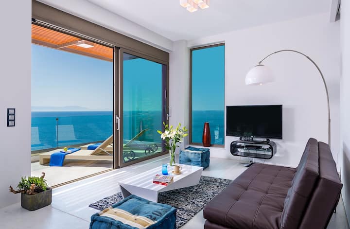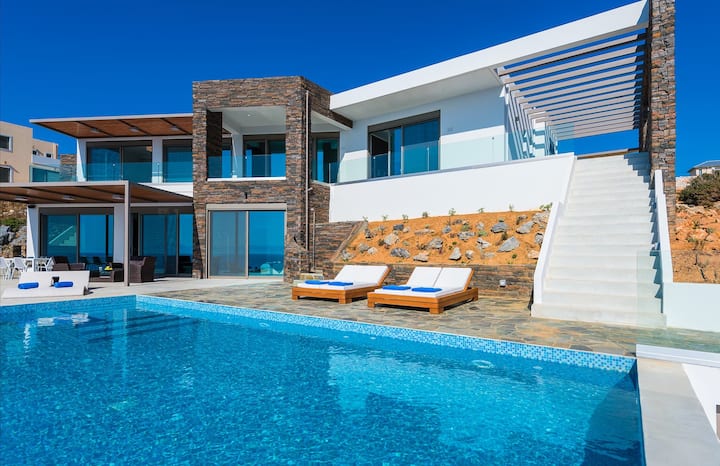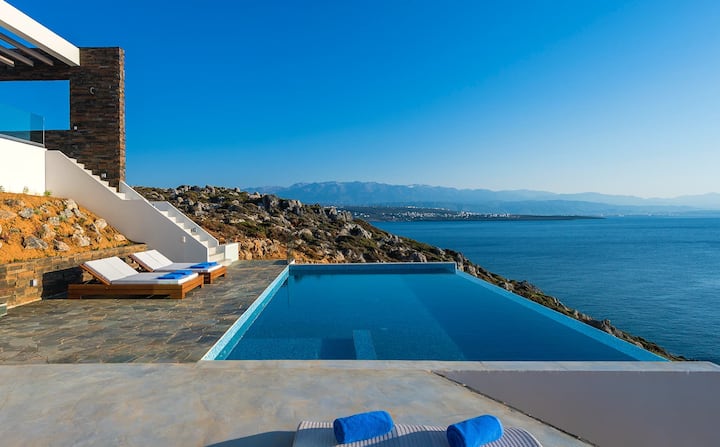 Elegantna luksuzna vila Blue Lagoon s pogledom na Chaniu i morem na samom pragu. BONUS: nude izravan pristup moru preko privatne staze koja vodi do stjenovite obale.