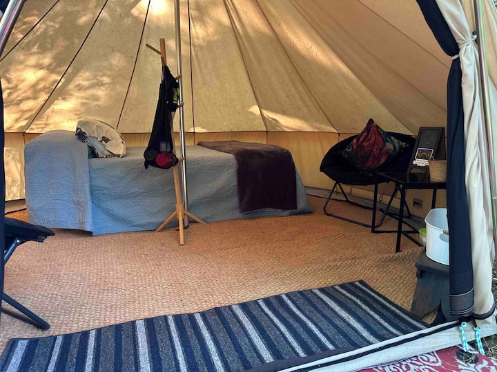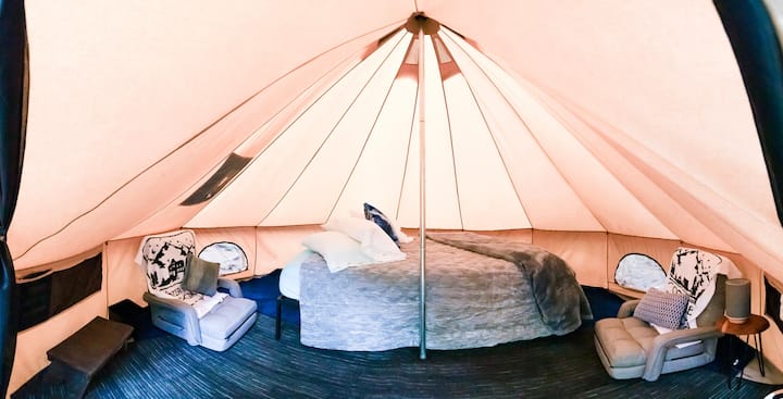 S 9 osamljenih Glampsita, pomislit ćete da ste u raju. Luksuzno opremljeni bračni kreveti od memorijske pjene, prostrane vanjske terase i svi sadržaji koji su vam potrebni su osigurani. Također imamo 2 grupna šatora s po 2 luksuzna bračna kreveta. Imamo potpuno opremljenu vanjsku kuhinju, 2 kupaonice i 2 tuša s ručnicima itd.