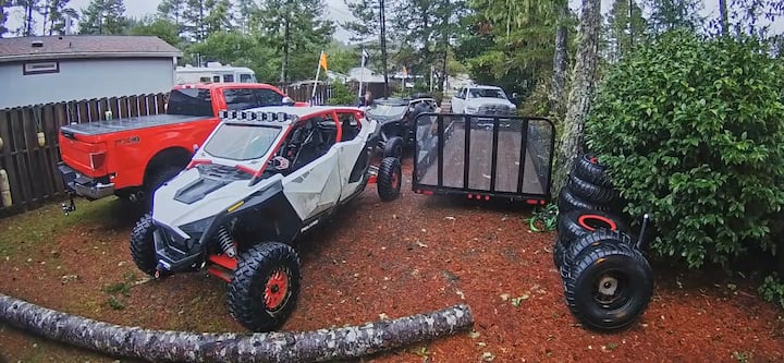 Općenito govoreći, imamo dugi ograđeni prilaz. Unutar ulaza ima prostora za ATV-ove i većinu ATV prikolica unutar našeg privatnog parkirališta. Prilaz je 60 stopa dubok do vrata. Međutim, može biti teško kretati se prikolicama jer su vrata široka 11 stopa i omeđena velikim drvećem, a mi smo na kraju uske slijepe uličice. Ulaz je zona prsta između drveća i uličnih štapova. Prikolice moraju biti poduprte ili povučene. Na ulici se nalazi i štap za komunalne usluge. Nema mjesta za okretanje vozila na imanju.