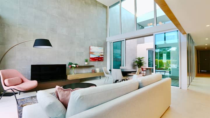 Suvremena arhitektura, upotreba dvostruko ostakljenih prozora, prvoklasni materijali i kuhinja u stilu „otvorenog prostora” nude svjetlost i savršenu povezanost s prirodom i okolnim vrtovima.
