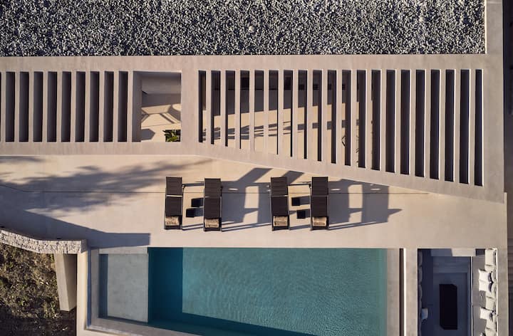 Prvi kat sastoji se od potpuno opremljenog dnevnog boravka i kuhinje sa svim modernim sadržajima, dvije spavaće sobe i WC-a. Veliki klizni prozori od poda do stropa vode do vanjskog prostora vile koji ima bazen s ležaljkama za sunčanje, potpuno opremljen roštilj u američkom stilu s vanjskom blagovaonicom i posebno dizajnirano mjesto za sjedenje kako biste uživali u neometanom pogledu i spokoju zelenog okruženja daleko od gužve i vreve masovnog turizma i znatiželjnih očiju, zagrijanog autentičnošću i mirisima grčke zemlje. Veliki prozori omogućuju prirodnim ljepotama vanjskog krajolika da napadnu i ujedine se s mirom elegantnog uređenja interijera Villas, stvarajući čaroban prostor koji čeka da ugosti vaše dragocjene jedinstvene trenutke.