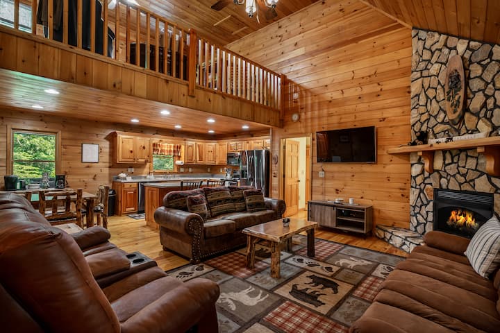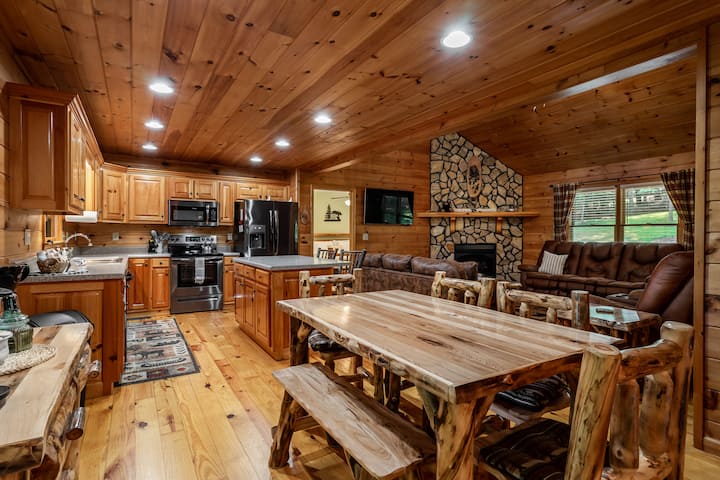 Drvena kuća u odmaralištu s pogledom na jelene, ognjištem i sadržajima