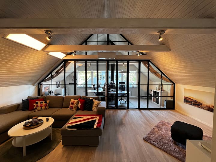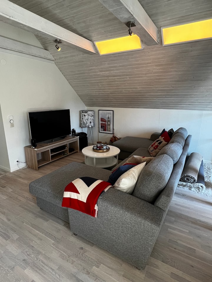 Osim toga, na gornjem katu nalazi se lijepa soba u potkrovlju s dnevnim boravkom i 55-inčnim pametnim televizorom te prostor za čitanje/opuštanje s foteljom i tabureom. U proljeće 2022. godine izgradili smo dva ugađena ureda na krovu i ako je potrebno više ležajeva od onih u spavaćim sobama i na kaučima, u tim se prostorijama mogu postaviti madraci.