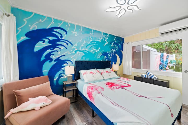 Uživajte u privatnom smještaju na otoku Siesta Key sa svijetlim, modernim uređenjem, udobnom spavaćom sobom, otvorenim dnevnim boravkom i potpuno opremljenom kuhinjom. Izađite u ograđeno dvorište s bazenom, masažnom kadom i šarenim muralima – savršeno za opuštanje ili snimanje zabavnih fotografija.