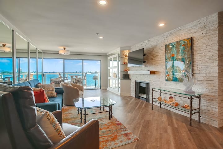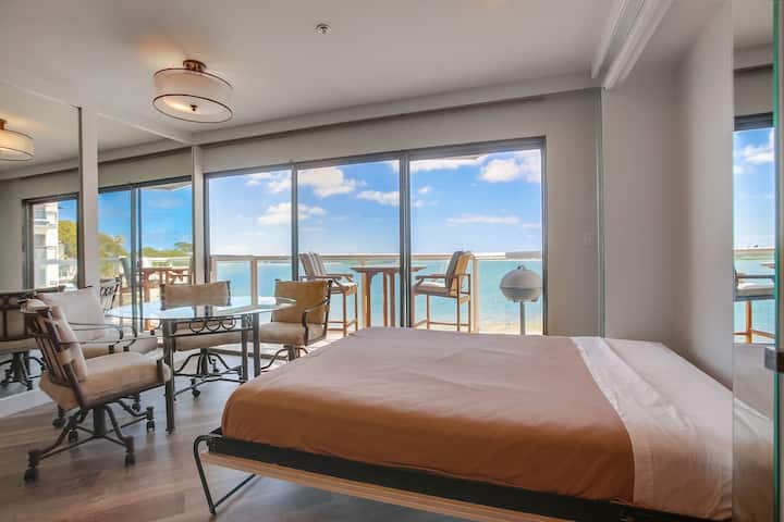 Stol za objedovanje/igru s 4 okretne stolice nalazi se odmah pored kliznih staklenih vrata koja otvaraju 2,5 metra kako bi se osjetio osjećaj „al fresco”. Ugradbena rasvjeta koja se može prigušiti omogućuje vam da imate onoliko svjetla koliko želite, kao i praktične rolete na daljinsko upravljanje. Opustite se u okretnom naslonjaču ili se smjestite na novom kauču nakon dugog dana razgledavanja. Pametni TV od 50 inča s YouTube TV kanalima za streaming nalazi se iznad reflektujućeg kristalnog kamina na prirodni plin koji stvara ugodan i romantičan ambijent. Bračni krevet Murphy lako se spušta sa zida s ogledalima odmah pored kliznih staklenih vrata, što vam daje osjećaj da spavate iznad vode. Probudite se u mekim jutarnjim bojama i promatrajte morske ptice kako se igraju na rubu vode. Skuhajte kavu u Keurigu (K šalice su uključene) i sjednite na balkon koji visi iznad pijeska kako biste promatrali kako zaljev oživljava dok ženski veslački tim UCSD-a tiho prolazi kroz staklenu vodu i ranojutarnji šetači i trkači prolaze šetalištem ispod. Ako je potrebna dodatna spavaća soba, stražnja strana kauča se slaže, a donja polovica klizi i iskače prema gore kako bi se ispred kamina i televizora napravio kvadratni krevet od 70" x 70".