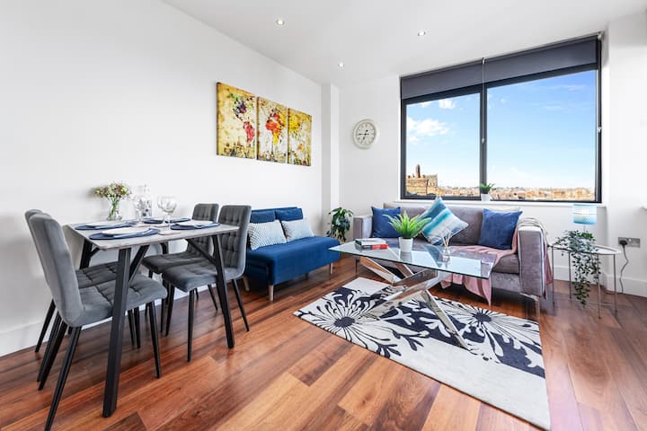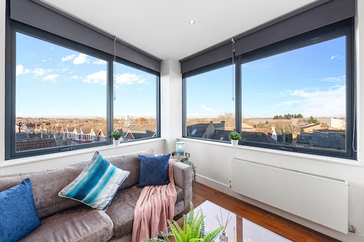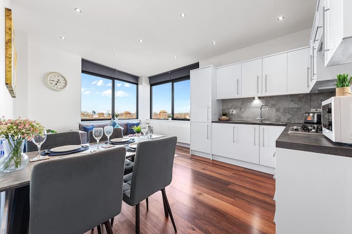 Smješten u srcu Wimbledona – čim zakoračite u moderan stan, dočekuje vas vrlo elegantan, ali vrlo udoban dnevni boravak otvorenog tipa s prekrasnim pogledom na londonsko nebo. Dizajniran je i uređen na raskošan način koji upotpunjuje fantastičnu lokaciju ove četvrti u središtu Londona. Kad izađete iz dnevnog boravka, otkrit ćete dvije udobne spavaće sobe s udobnošću odmarališta s 5☆ koje vam omogućuju da se odmorite nakon uzbudljivog dana avanture po gradu.