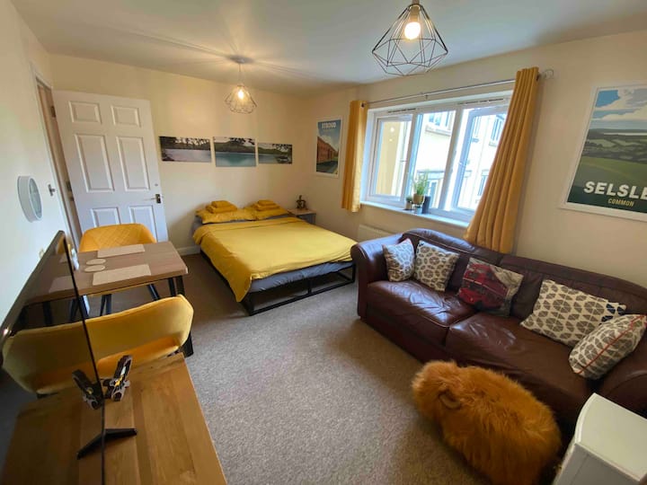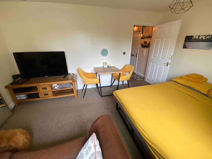 Spavaća soba s dnevnim boravkom i parkiralištem uz cestu