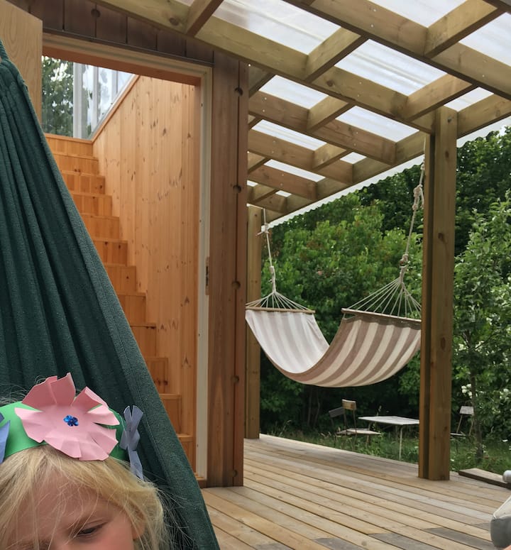 Ljeti se dnevni boravak proširuje za više od 50 četvornih metara kroz verandu koja se nalazi u izravnoj vezi. Na trijemu (koji je zaštićen pod krovom) nalaze se tri različita prostora za sjedenje, tri viseće ležaljke i viseća ležaljka. Na trijemu možete uživati u jutarnjoj kavi na jutarnjem suncu, hladnom piću na poslijepodnevnom suncu ili u hladovini kada je sunce na najvišoj razini tijekom dana. S trijema možete se popeti stepenicama do Glasverandana koji nudi sunce cijeli dan od trenutka kad se uzdiže iznad ruba šume na istoku do posljednjih zraka prije nego što padne u more na zapadu.