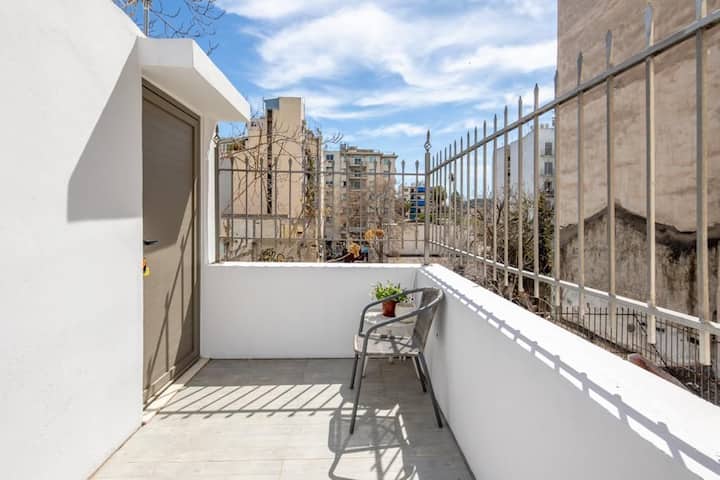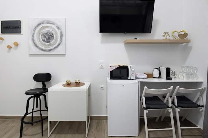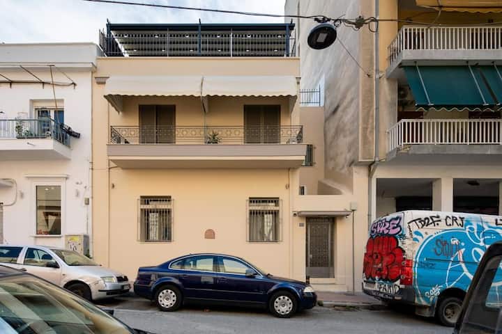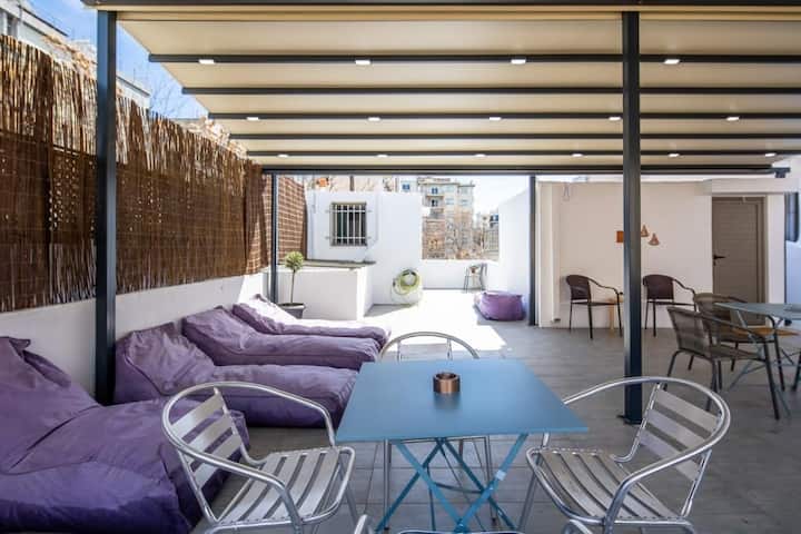 Mali, ali praktični studio za najviše 4 gosta, s bračnim krevetom na donjem dijelu i polubračnim krevetom na kat (širine 120 cm). Nema privatne kuhinje, ali postoji zajednička kuhinja na krovu. Prostor je kompaktan, pa bi velika prtljaga mogla biti problem, ali je savršen za kraće boravke. Svi glavni spomenici i znamenitosti nalaze se na pješačkoj udaljenosti, što je idealno za istraživanje Atene pješice.
