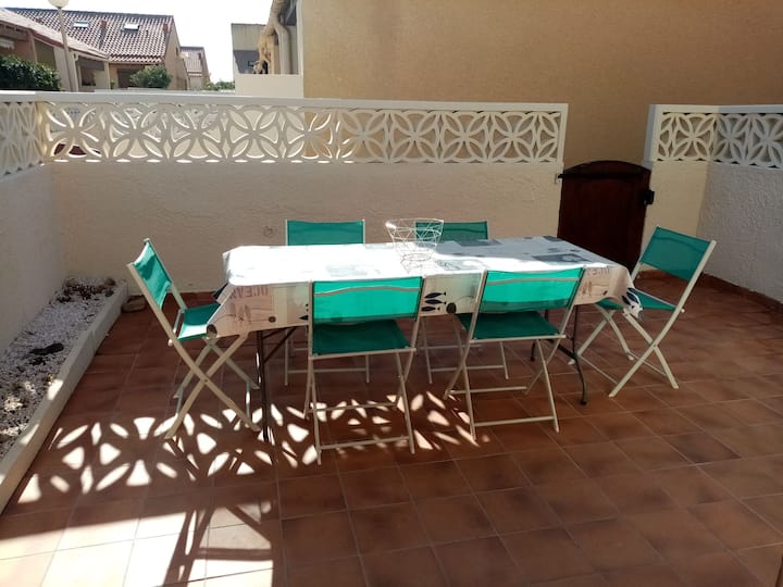 Maisonette located by the sea, with sea views, 50m from the beach on Port Leucate, seaside resort, blue flag sea pearl, Résidence la Grande Bleue, furnished tourist accommodation 2*, 6 people, 2 bedroom with 140 beds, equipped kitchen, living room,mezzanine with bunk beds,all comfort,about 40m2,very sunny and bright,direct beach (no road to cross), 20m2 closed and tiled terrace, reversible air conditioning, secure private parking (no camping because in summer H2 meters)