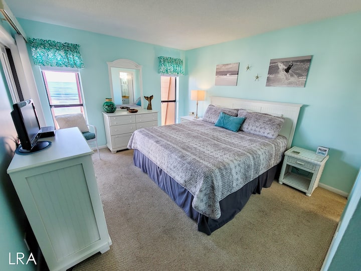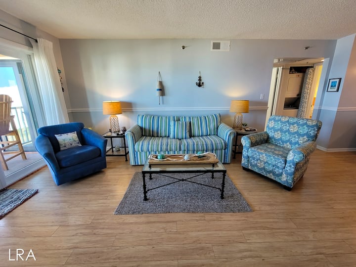Kad prvi put stignete, na otvorenom ćete pronaći parking. Svaki stan ima dva parkirna mjesta, a propusnice će biti osigurane prilikom dolaska. Za početak otvorite stubište na 3. kat i upotrijebite svoj pristupni kod bez ključa. Prekrasan pogled na ocean dočekuje vas dok dolazite niz hodnik i ulazite u glavni dnevni boravak stana. Dnevni boravak ima dovoljno mjesta za sjedenje, kauč na razvlačenje (Queen Sleeper), veliki TV ravnog ekrana i pristup prostranoj terasi uz obalu oceana. Izađite kroz klizna staklena vrata i pustite da vam slani zrak otopi probleme. Uživajte u jutarnjoj kavi s pogledom na prekrasan Atlantski ocean. Pažljivo pripazite ili ćete možda propustiti dupine dok plivaju!