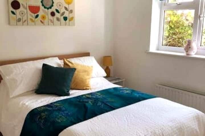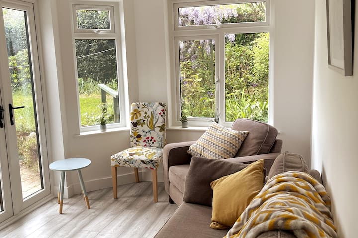 Dnevni boravak i blagovaonica imaju francuska vrata i pogled na vrt i terasu. Na zidu se nalazi 43-inčni pametni TV s besplatnim pogledom i na kojem možete pristupiti Netflixu i Amazon Primeu, među ostalim aplikacijama. Stavili smo nekoliko igara u kutiju za pohranu za dodatnu zabavu. Stol za objedovanje ima prostor za sjedenje za 4 osobe, ali se po potrebi može produžiti na 6 sjedala. U kuhinji se nalazi dodatni mali stolić (i dodatne 3 sklopive stolice za njega)