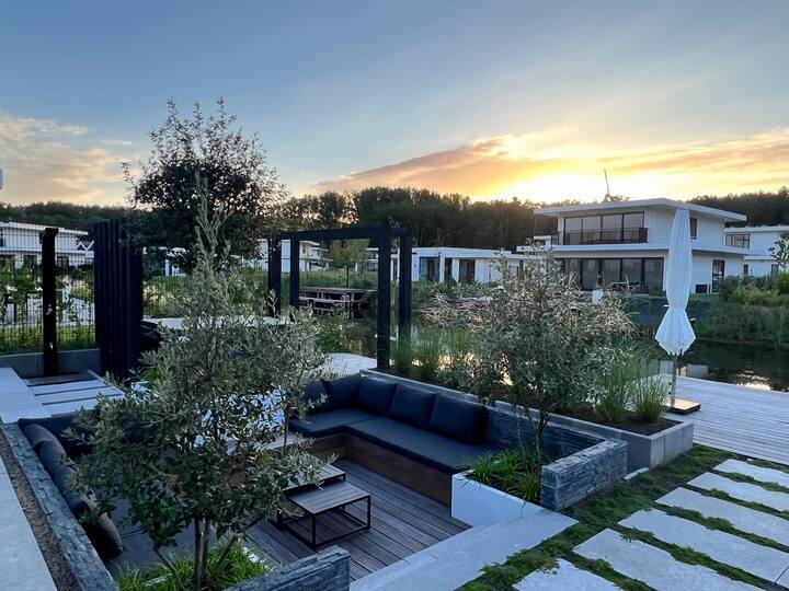 Smještena u mirnom zelenilu Flevolanda, ova elegantna vila nudi skladan spoj udobnosti i stila. Privatni pristanište, ograđeni vrt i luksuzna masažna kada na otvorenom čine ga savršenim odredištem za one koji traže odmor i rekreaciju. Djeca mogu uživati u privatnom trampolinu i ljuljački, dok se odrasli mogu opustiti na terasi ili pod vanjskim tušem. Unutra ćete pronaći moderan dnevni boravak s klima-uređajem, podnim grijanjem i elegantnom kuhinjom idealnom za pripremu nezaboravnih obroka s prijateljima ili obitelji. Lokacija vile predstavlja najbolje što regija nudi. Istražite mirno jezero Veluwemeer, udaljeno samo 2 km, idealno za vodene sportove ili šetnje uz obalu. Ljubitelji golfa cijenit će blizinu Harderwold Golf & Events (400 m), dok ljubitelji uzbuđenja mogu uživati u danu u Walibi Holland (14,5 km). Ljubitelji prirode mogu prošetati Harderbosom ili se odvesti na slikovitu izlet u povijesne hanzeatske gradove kao što su Elburg i Kampen. Za obitelji, Dolfinarium Harderwijk (4,9 km) nudi čarobni dan s morskim životom, udaljen samo nekoliko minuta. Kad dođe vrijeme da se počastite, na samo nekoliko minuta hoda pronaći ćete izvrsne restorane. Uživajte u profinjenom obroku u Brasserie Harderwold (500 m) ili doživite ugodan nizozemski šarm 't Huus van Guus (2,2 km). Za shopping, Bataviastad Fashion Outlet udaljen je samo 26,8 km. Bez obzira na to pijete li vino iz hladnjaka u vili ili večerate na otvorenom uz roštilj na ugljen, svaki trenutak ovdje jamči udobnost, dobar okus i trajne uspomene.