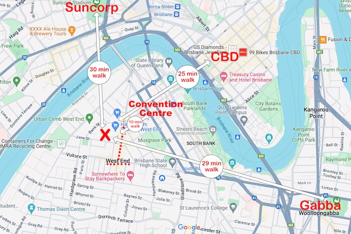 Ovaj je stan odlična baza za stadion Suncorp. Udaljeno je 10 minuta vožnje automobilom ili 15 minuta vožnje autobusom. Mnogi gosti odsjedaju ovdje kad su u gradu zbog ragbi utakmica, koncerata i utakmica NRL lige jer je West End živahan, ali noću miran.