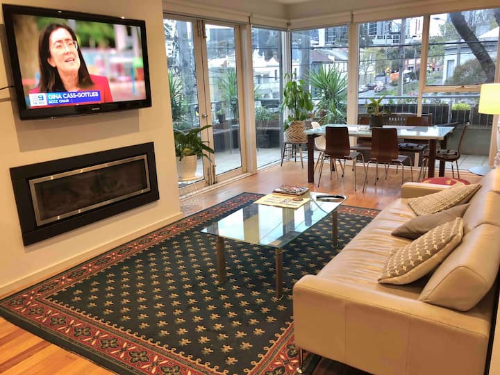 Moj privatni dom je moderna kuća u nizu na 3 razine u starinskim ulicama s drvoredima i lako je pješice ili tramvajem do centra Melbournea