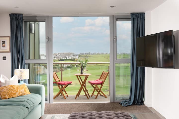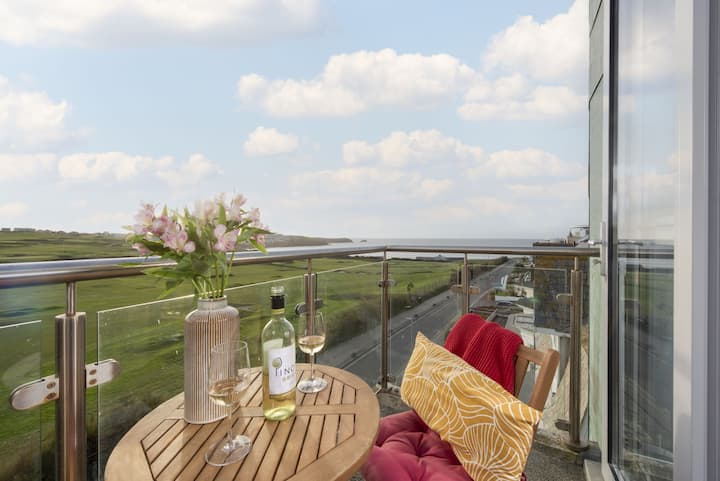 Ovaj prostrani penthouse apartman s pogledom na more s pogledom na more udaljen je samo nekoliko minuta hoda od plaže Fistral Beach. S pogledom na teren za golf pruža se predivan pogled na plažu Fistral s balkona. Moderan, prostran i prozračan s velikim dnevnim boravkom / blagovaonicom i kuhinjom otvorenog tipa te 3 spavaće sobe (od kojih je jedna en-suite) i mezaninom s bračnim krevetom. Dječja soba na kat s pogledom na more također ima radni stol i stolicu za one koji moraju raditi.