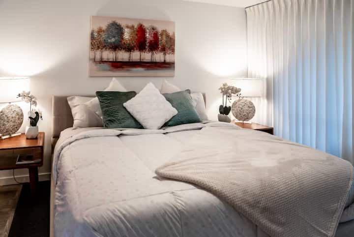 Moderan novi studio, veliki bračni krevet, djelomičan pogled na ocean